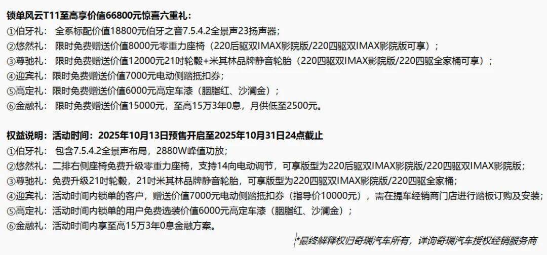 风云T11已正式开启预售,共推出4款版型,其中220后驱伯牙巨幕奢享版预售价19.99万元;220后驱双IMAX影院版预售价21.99万元;220四驱双IMAX影院版预售价24.39万元 ;220四驱全家桶预售价26.49万元。同时,发布会现场公布了以下多重极具诚意的预售权益,为用户带来“一步到位”的豪华拥车体验。