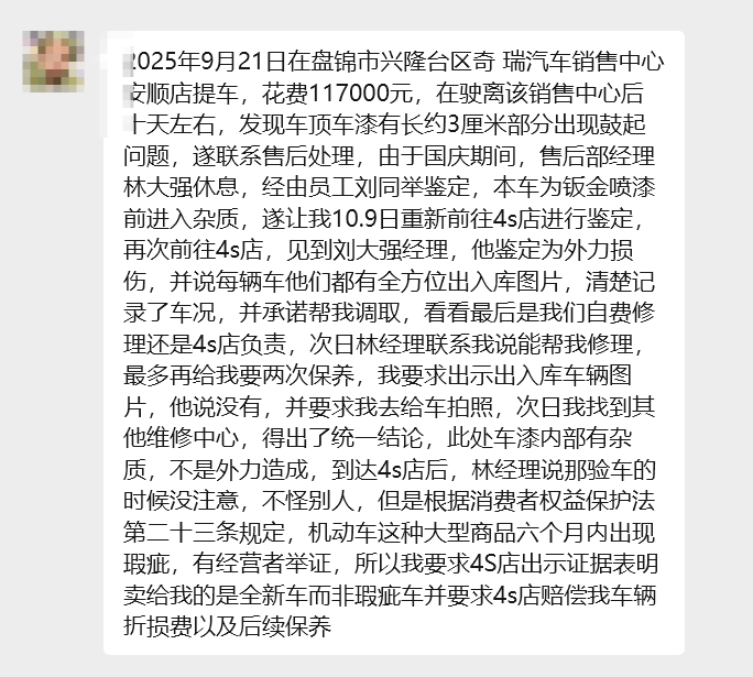 2025 年 9 月 21 日,陈先生在盘锦市兴隆台区奇瑞汽车销售中心安顺店购置风云T9,购车花费 117000 元。驶离销售中心约十天后,陈先生发现车顶车漆有长约 3 厘米的部分出现鼓起现象,随即联系 4S 店售后寻求处理。