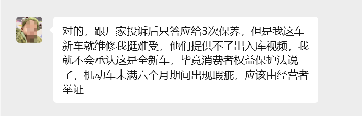 截至发稿,风云厂商只答应给3次保养,但是陈先生认为,这车新车就维修挺难受,既然对方提供不了出入库视频,就不会承认这是全新车,毕竟消费者权益保护法说了,机动车未满六个月期间出现瑕疵,应该由经营者举证双方尚未就上述诉求达成一致。