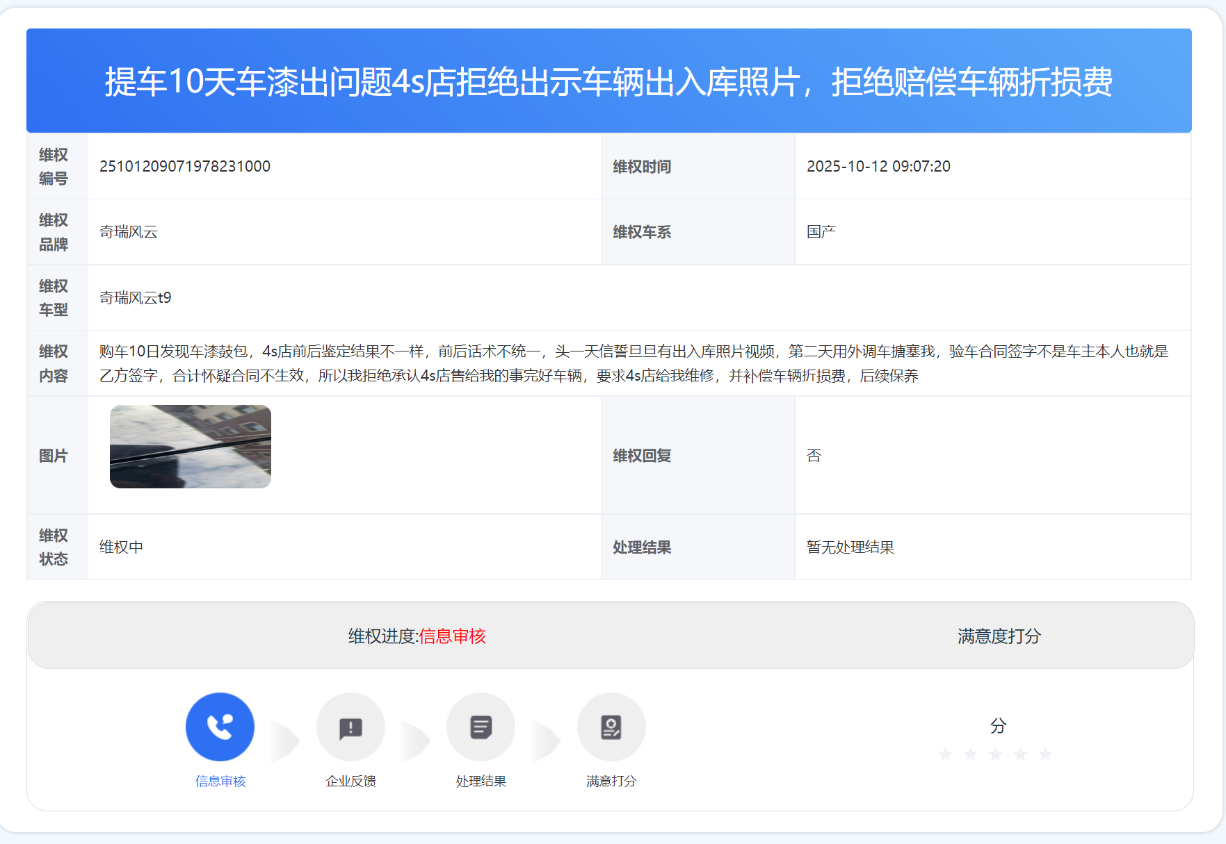 近日,盘锦市陈先生向车质帮反映,其在当地奇瑞汽车销售中心安顺店购买的风云T9,提车仅十天便出现车漆鼓包问题,与 4S 店协商过程中,双方就问题成因及责任归属存在分歧。
