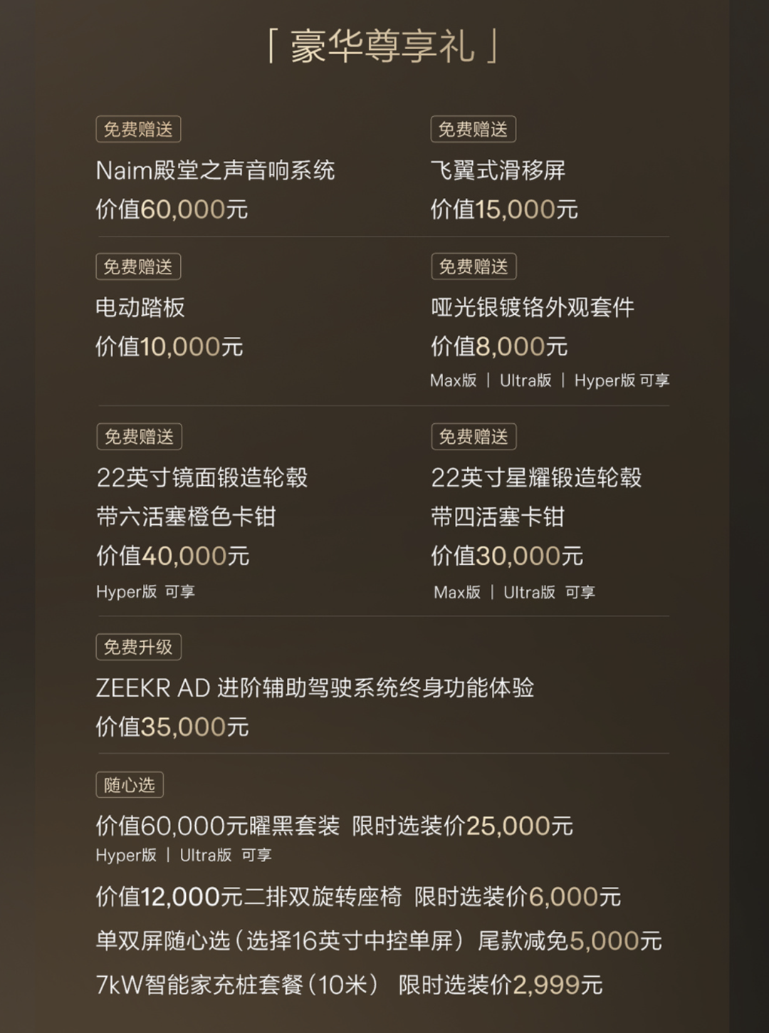 “杭州湾库里南”极氪9X则是赠送了Naim殿堂之声音响系统、飞翼式滑移屏、电动踏板、22英寸大轮毂等配置;并且选配的二排旋转座椅以及曜黑套件也都给予了一定的折扣。