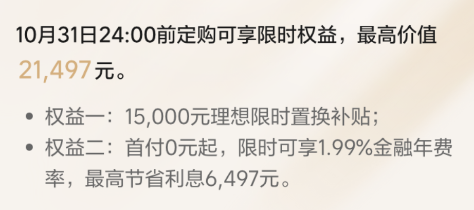 过去L6的5年0息以及L7、L8、L9的3年0息方案被理想官方的1.5万元官方置换补贴所替代,更加利好全款置换的朋友们。