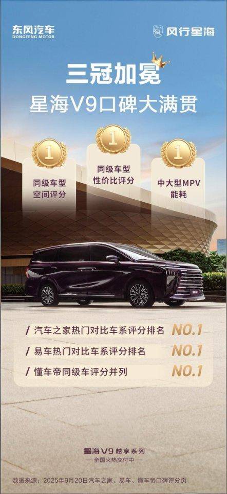 市场与用户的双重认可是品牌使命的最佳注脚。星海 V9 不仅登顶乘联会细分市场销量榜首,更斩获汽车之家、易车、懂车帝三大平台口碑冠军,在空间、性价比、能耗维度均获领先评分。“花不到 20 万买到 40 万配置” 的用户评价,精准诠释了东风风行 “致力让豪华 MPV 走进千家万户” 的初心。从赛事场馆的高端展示到家庭车库的日常使用,星海 V9 以现象级表现证明:豪华并非高价专属,而是技术普惠的必然结果。