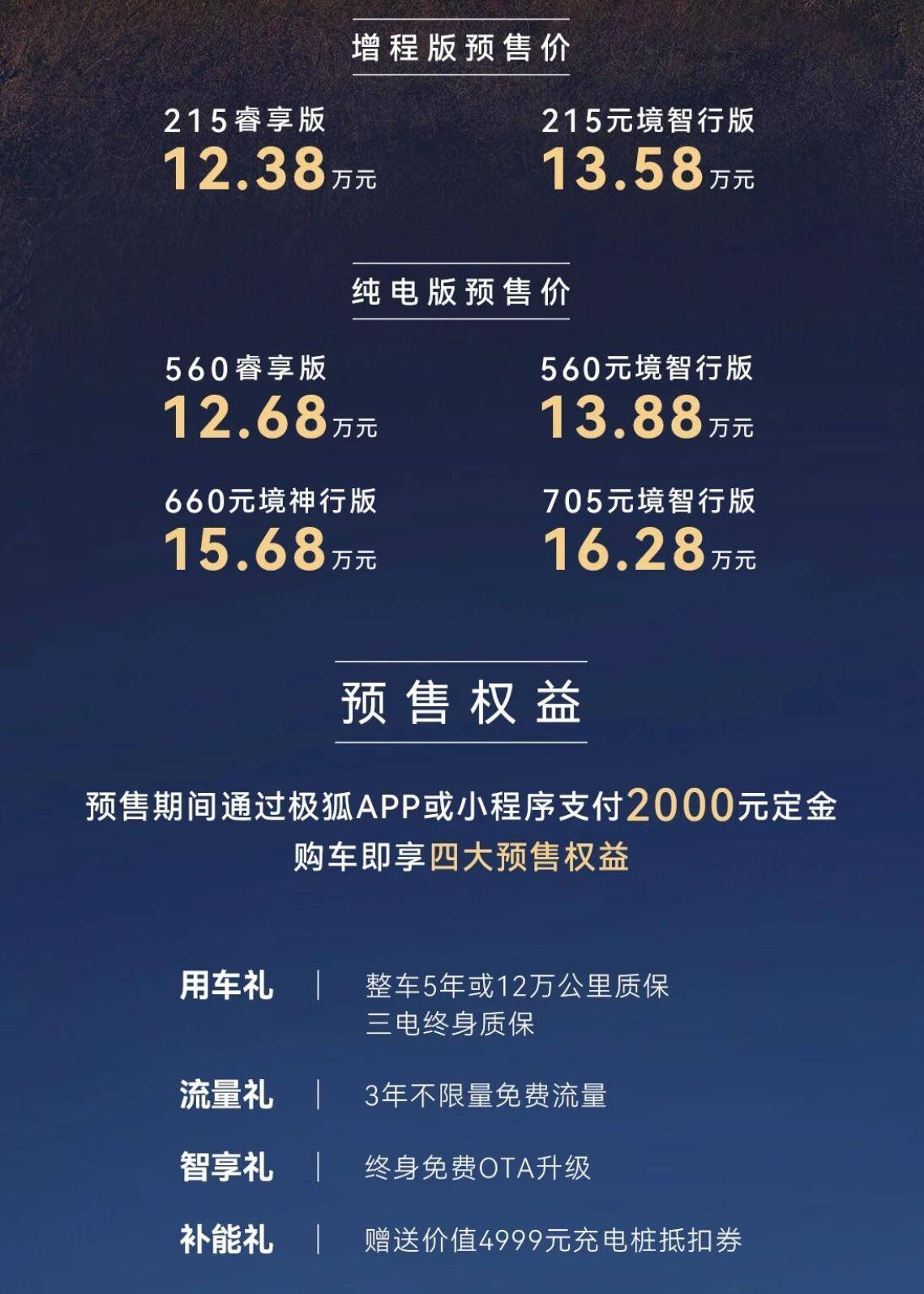 就在今天(10月14日)极狐阿尔法T5正式开启预售,新车共推出6款车型,有增程和纯电两个版本,预售价区间为12.38-16.28万元。目前支付2000元定金,可享四大预售权益,包括用车礼、流量礼、智享礼和补能礼。