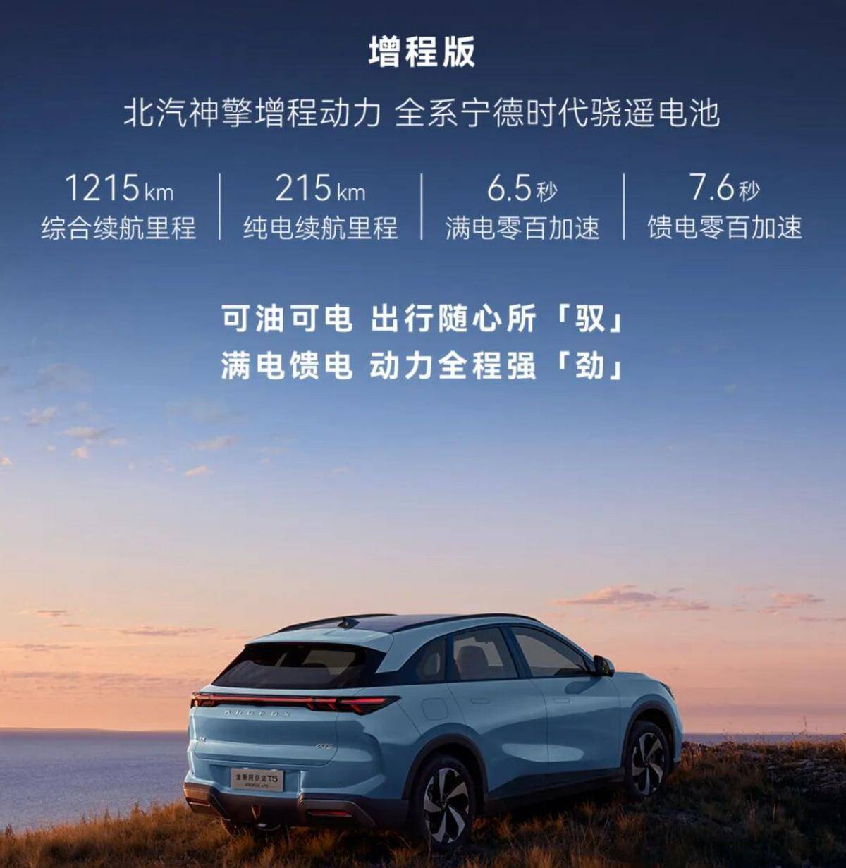 首先来看核心的增程动力系统,它采用1.5L北汽神擎增程,纯电续航215公里,综合续航1215公里,全系搭载宁德时代骁遥电池,单从硬件水准来看,确实挑不出太多的毛病。再加上12.38起的预售价,就连同为增程的零跑C10也要礼让三分。