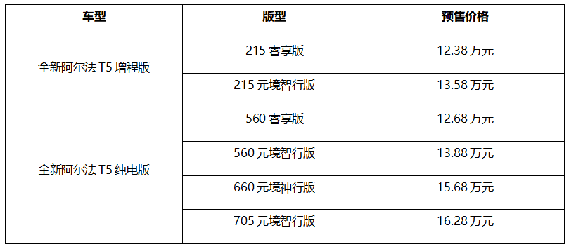 据悉,极狐全新阿尔法T5预售共推出6个版型,包含纯电和增程两种动力形式,预售价格12.38万元—16.28万元,以更年轻的设计风格、更强的动力续航、更智能的操控、更舒适的驾乘和天花板级的安全健康,为年轻家庭用户带来了中级SUV的新选择。即日起通过极狐APP或小程序支付2000元定金,购车可以享受整车5年或12万公里质保、三电终身质保、3年免费不限量数据流量、终身免费OTA升级、价值4999元充电桩安装抵扣券等四重礼遇,再次刷新中级SUV的价值标准!