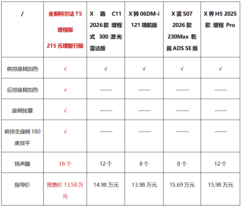 现代家庭生活中,车已经成为“移动的家”。全新阿尔法T5以“家庭第二空间”为目标场景,标配“主副驾座椅一键放平”、“全车座椅加热”、“前排座椅通风”、“8点位座椅按摩”、“1.68平米穹顶全景天幕”、“电动天窗遮阳帘”和“18扬HIFI天空音乐行宫”等,打造出诸多“同级唯一”的越级舒享配置,让全家人时刻都拥有家的温馨惬意。
