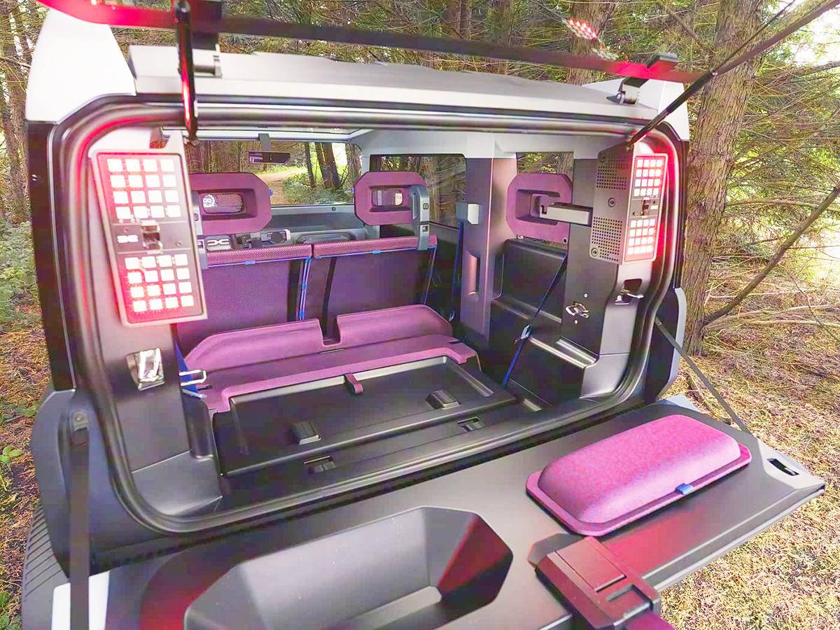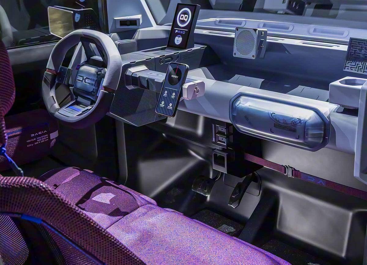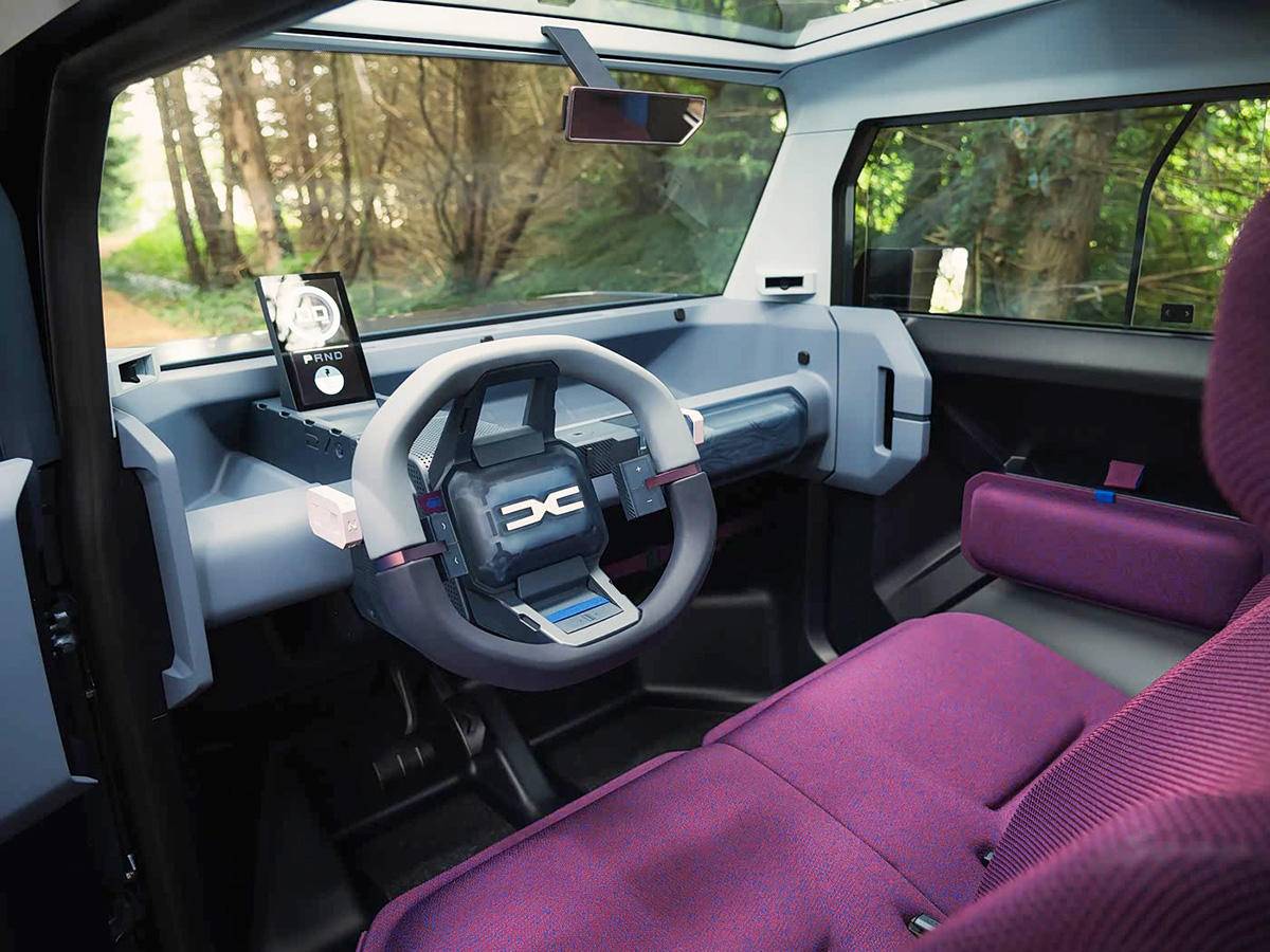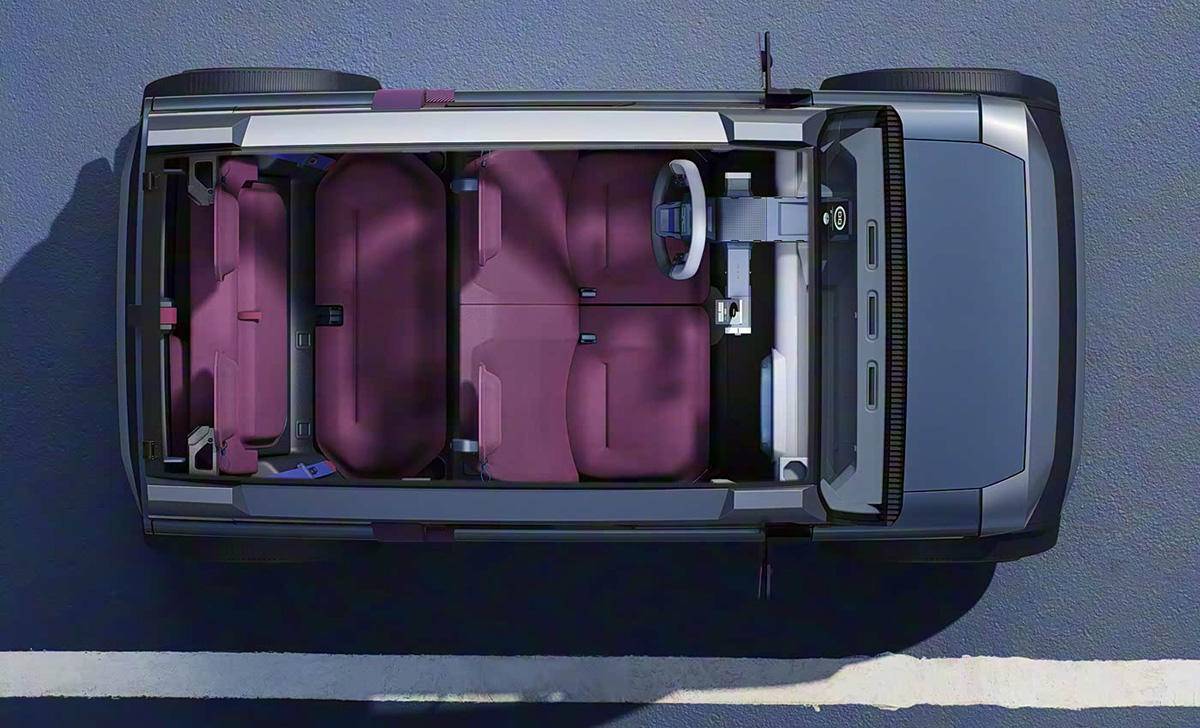 内饰部分,中控台使用了开放式的设计,取消了传统的中控面板,能够看到部分内部结构,有着不错的机械感,方向盘前部靠近风挡的位置带有一块竖屏,其余部分提供了多个拓展孔位,方向盘的造型很科幻,前排地板是贯通式布局。
