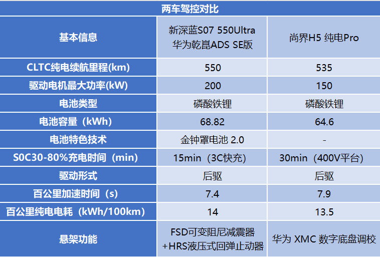 我们针对用户关心的驾控感受、续航能力、充电效率、驾驶辅助能力、车机功能、舒适性等多方面进行比拼,全新深蓝S07带给我们的惊喜还是挺大的,续航达到550km,15分钟快速补能,全系标配华为乾崑ADS SE、FSD+HRS悬架,还提供双零重力座椅、20扬声器杜比全景声,诚意满满,买它更省心。尚界H5作为价格最便宜的鸿蒙智行产品,鸿蒙座舱和华为ADS驾驶辅助方案是它的主要卖点,但充电效率、舒适性表现还有提升空间,如果你愿意为“花粉情怀”溢价买单,也不失为一个好选择。大家按需选购吧。