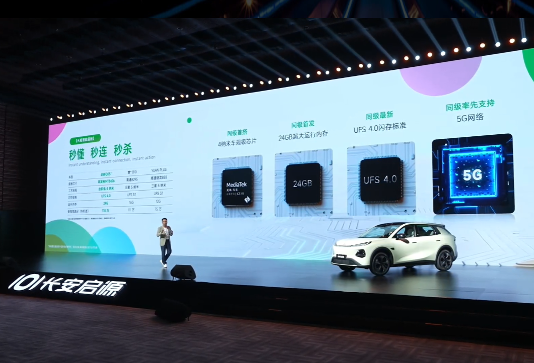 车内搭载10.17英寸液晶仪表、15.6英寸中控屏,同级首发新一代4nm座舱芯片,并拥有24G运行内存、UFS4.0内存标准、5G网络,确保操作运行流畅。此外还支持无麦K歌,提升了用车乐趣。