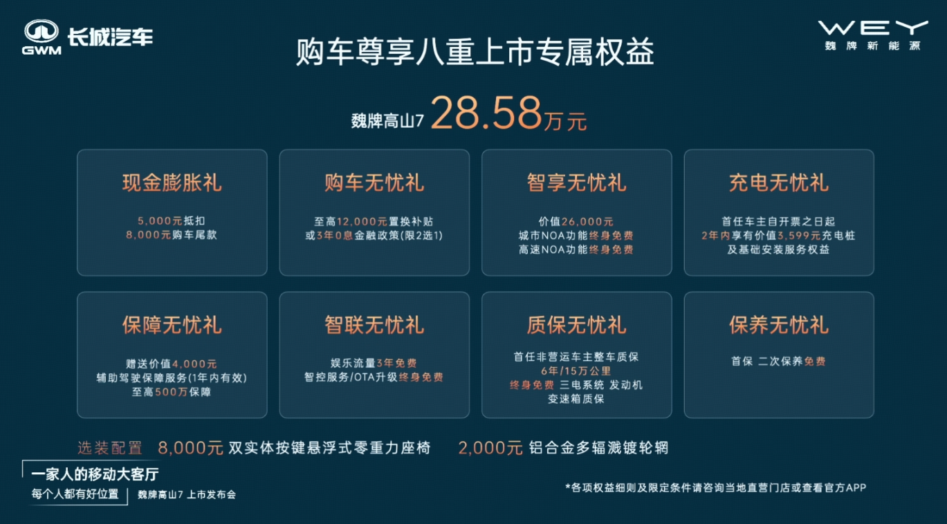 10月15日,魏牌高山7正式上市,售价:28.58万元,且终身免费三电系统、发动机、变速箱质保。