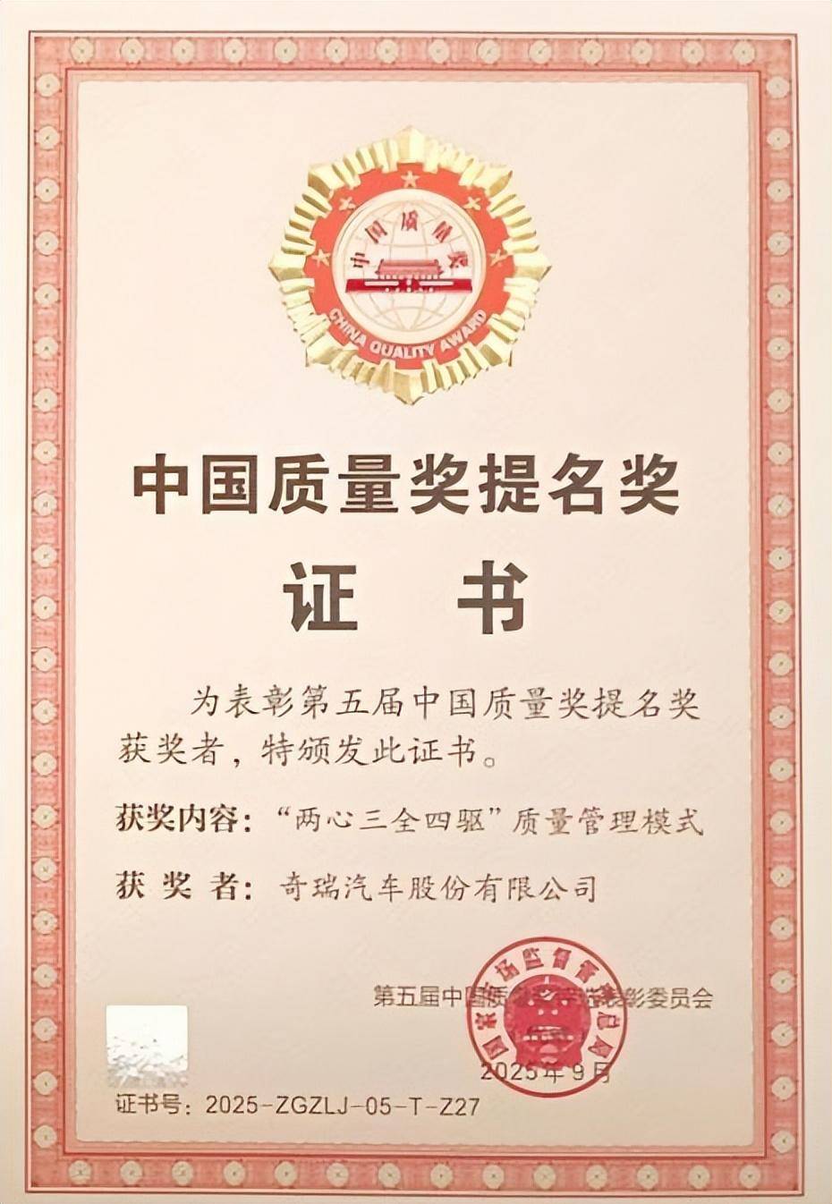 奇瑞把质量视为企业良心和长期追求。9月8日,星纪元ES获得欧洲ENCAP五星安全认证,至此集团累计51款车型获全球各类五星安全认证,是获得全球五星安全最多的中国品牌。凭借独创的“两心三全四驱”质量管理模式,奇瑞汽车还在9月份获得中国质量领域最高荣誉认可——中国质量奖提名奖。