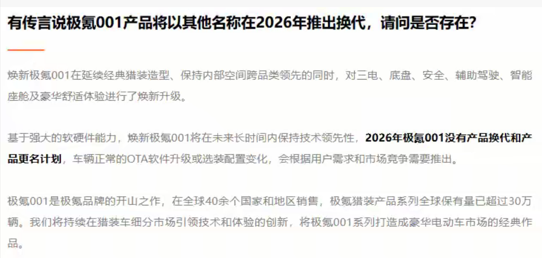 显然,在官方回应中,极氪方面开宗明义对于相关“换代”传言给出了否定回答。极氪明确否认2026年“产品换代”以及“更名”的消息。