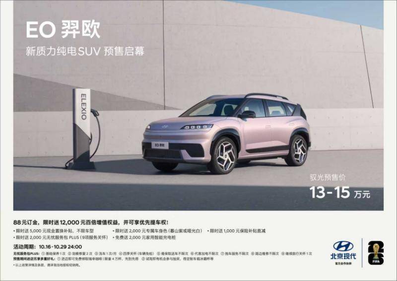 10月16日北京现代旗下首款纯电平台SUV——EO羿欧正式启动预售,新车驭光预售价13-15万元,定位"15万内品质最好的纯电SUV"。此次预售不仅标志着北京现代电动化转型的全面启动,更在竞争日趋白热化的纯电市场中,以"高品质、高价值"的产品理念开辟新的发展路径。