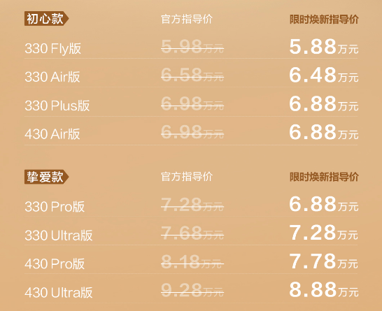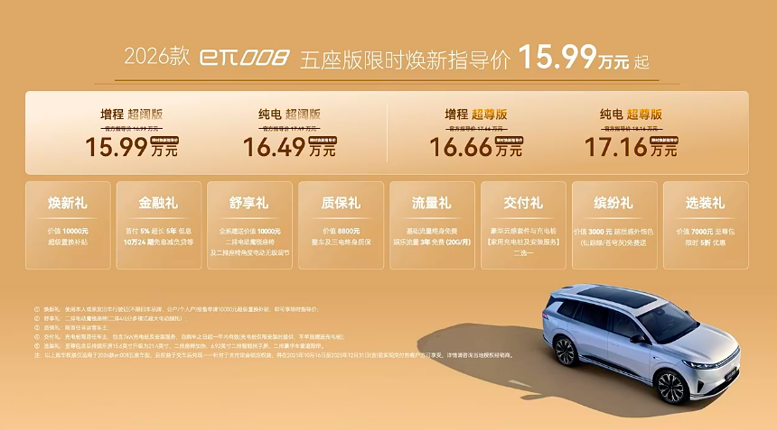2026款eπ008五座版售价:16.99万元-18.16万元,限时焕新价:15.99万元-17.16万元。