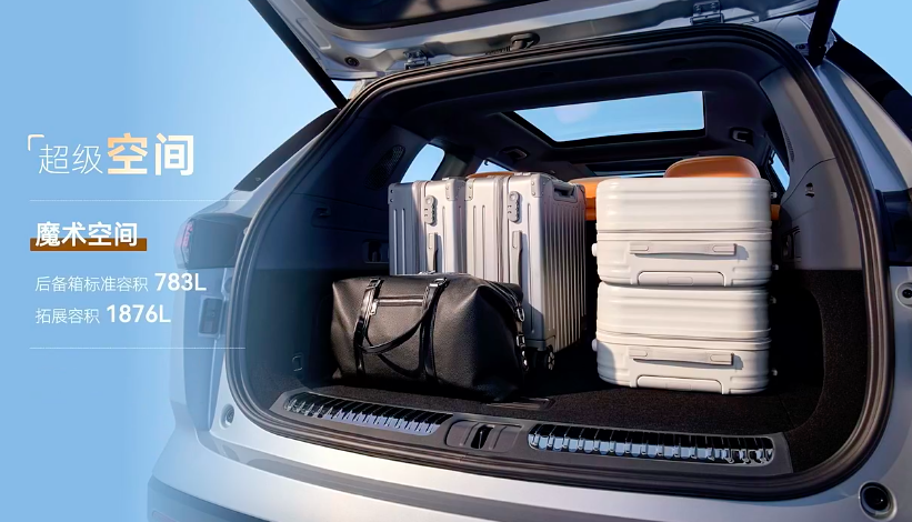新车造型大气,联合中国国家地理共创仙踪绿、苍穹灰两款新车色,增加年轻时尚属性。后备箱基础容积783L,后排放倒可增加到1876L,大空间很能装。
