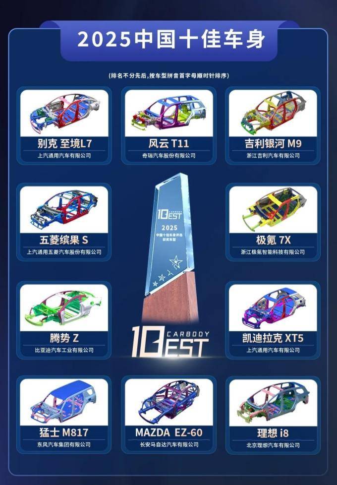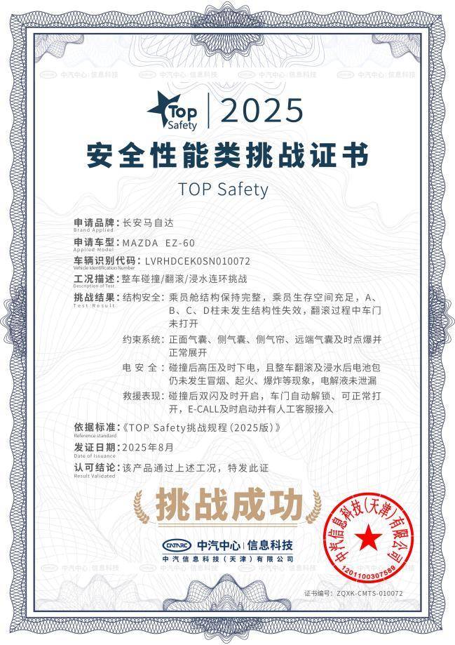 9月13日,「2025中国十佳车身」大奖评选结果正式揭晓,长安马自达MAZDA EZ-60(以下称EZ-60)凭借在车身安全、品质与工艺上的全方位创新突破,从百余款参评车型中脱颖而出,成功斩获「2025中国十佳车身」和「最佳材料奖」两项大奖。作为中国汽车车身领域最具权威性与公信力的评选之一,「中国十佳车身」大奖由国内顶尖汽车技术机构—中汽中心,以及汽车行业专家联合评定,堪称中国汽车车身技术领域的“奥斯卡”。此次EZ-60获此殊荣,不仅是行业对其车身技术实力的高度认可,更标志着合资智造在车身安全领域迎来全新标杆。