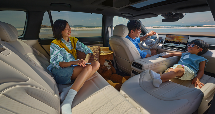 舒享配置上,二排电动魔毯座椅支持腿托分区域调节与靠背角度无极调整,结合主副驾联动形成的2米+L型“贵妃榻”,无论是亲子陪伴还是长途休憩,皆能享受头等舱级体验。冷暖两用智能冰箱、21.4英寸后排娱乐屏、6.92英寸扶手屏及WANOS全景声18扬声器系统,共同营造“移动客厅”的沉浸氛围。