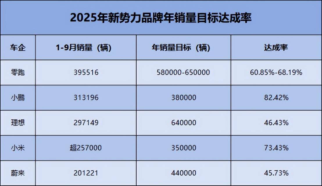 没有燃油车业务的利润支撑,缺乏成熟的渠道网络,新势力的生存完全依赖新能源车型的市场表现,这使得其目标达成情况呈现出更为极致的分化,头部玩家稳操胜券,中游企业奋力挣扎,上演了淘汰赛下的生死时速。