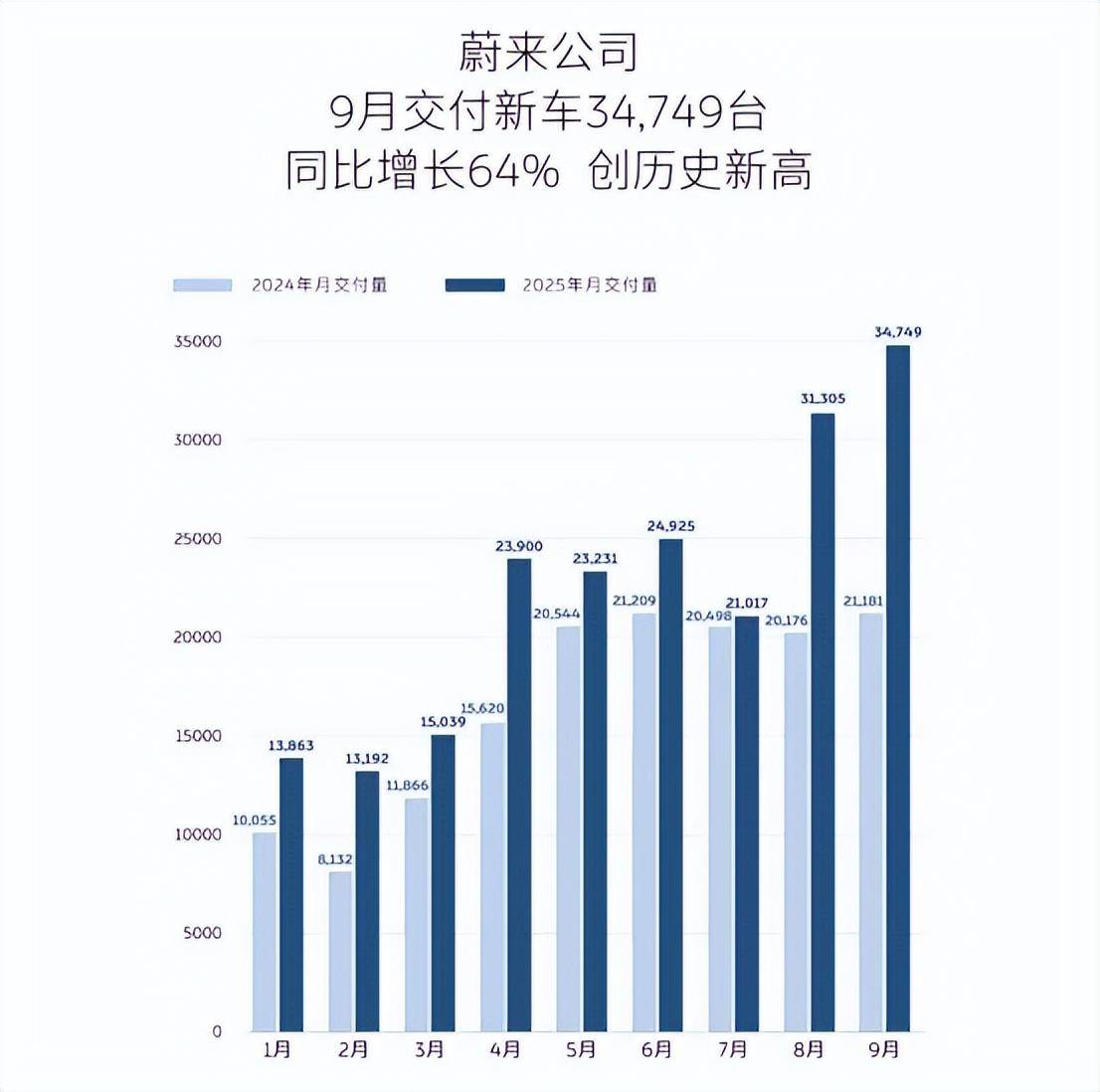 可以看出,其9月销量达34749辆,同比增长64%,创下了蔚来单月历史新高。