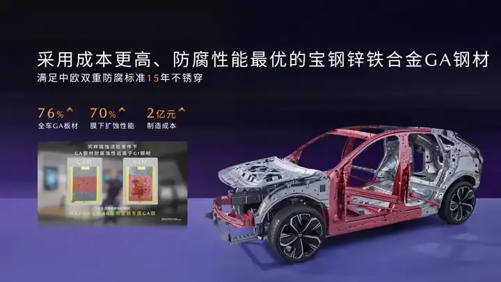 卓越的碰撞成绩来自于车身结构的创新。EZ-60采用7横5纵的笼式铠甲结构,高强钢占比86.5%,热成形钢27.45%,最高强度2000MPa,全车1500MPa及以上超高强度零件集群50个,关键部位更是层层加码,如A柱采用五重防护结构,内外双层1500MPa热成型钢和腔体SNS复合材料,大幅增强A柱的钣金强度和刚度,抗弯性能提升44%。