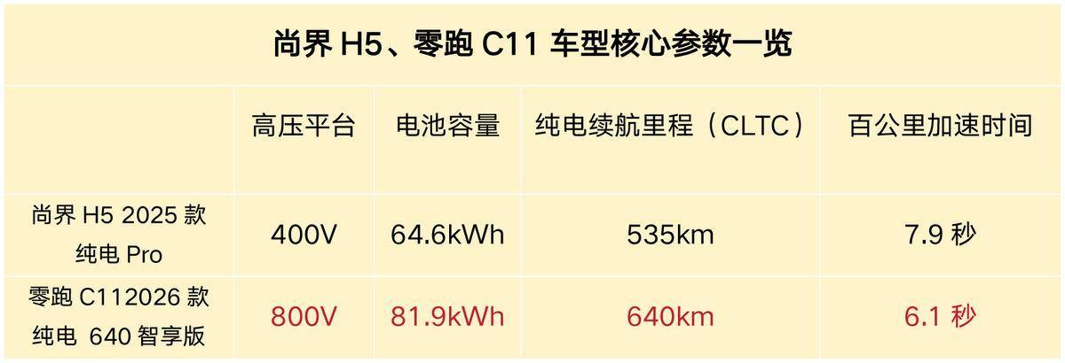 所以其实从品价比的角度来说,如果尚界H5不选装ADS 4.0,两者的价差是1.6万元,那么零跑C11的在核心参数上的优势是非常明显的,也基本上都是大家开电动车最关注的东西,也就是纯电续航里程、高压平台和加速能力;如果尚界H5选装了ADS 4.0,那么在驾驶辅助系统这一块,尚界毫无疑问是有优势的,对于追逐驾驶辅助的小伙伴来说,是值得购买的,但两者价差就达到了2.8万元,对于15—20万元预算的用户来说,不算个小数目,而且尚界H5在核心参数上的劣势并没有变化。