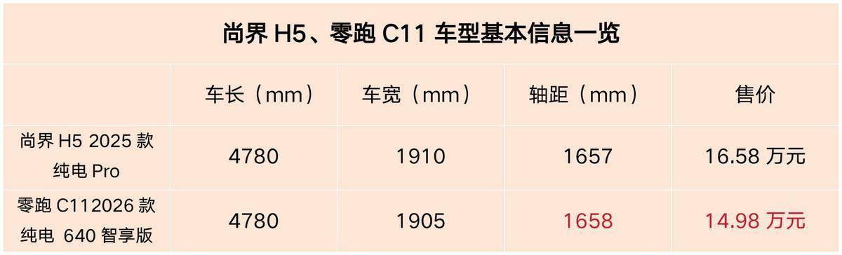 所以尚界H5上市之后,很多消费者就会很自然拿这款车和零跑的当家车型之一零跑C11对比一番,这一点基本上是不可避免的。所以与其小伙伴们纠结,还不如我们直接拿零跑C11和尚界H5纯电版的入门级车型进行对比,看看零跑C11能不能扛得住尚界H5的冲击,零跑C11 640智享版(以下称零跑C11)的售价为14.98万元,尚界H5 纯电Pro(以下称尚界H5)售价为16.58万元,两者价差为1.6万元。