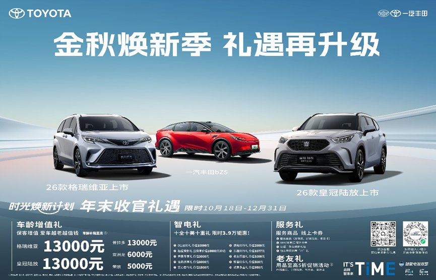 这个金秋,一汽丰田以诚意大礼和两款重磅车型的焕新上市,将先进科技与人文关怀融入到用户生活的每个细节,为用户提供了美好出行的新想象。诚如2026款格瑞维亚的口号,一汽丰田也正与用户,从我们的家到更好的家,一起创造美好,一起驶向更值得期待的新远方。
