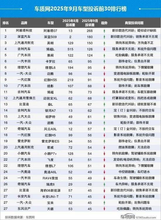 10月初,车质网发布9月份车辆投诉排行榜单,根据榜单显示,长安深蓝S09投诉榜单位居第二名,投诉共有180起,和投诉榜第3名拉开较大差距。其主要投诉问题同样是新旧款迭代纠纷与销售承诺不兑现,核心争议在于四个月前承诺的“一年保价”未明确包含配置升级场景,新款“加配不加价”导致老款车辆变相贬值,且品牌未给出合理补偿方案。