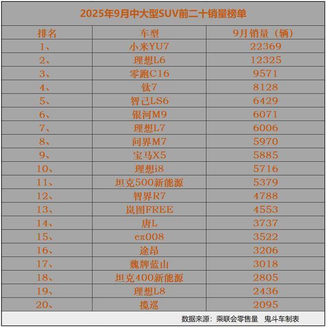 新车虽然多,具体销量表现并没有想象中那么给力。日前,9月乘联会零售销量数据出炉,鬼哥整理出9月中大型SUV排名前二十销量榜单,结果发现,榜单上,只有两款车型零售销量过万,这一细分市场典型的声量高,销量弱。接下来,看看具体车型销量表现与排名。