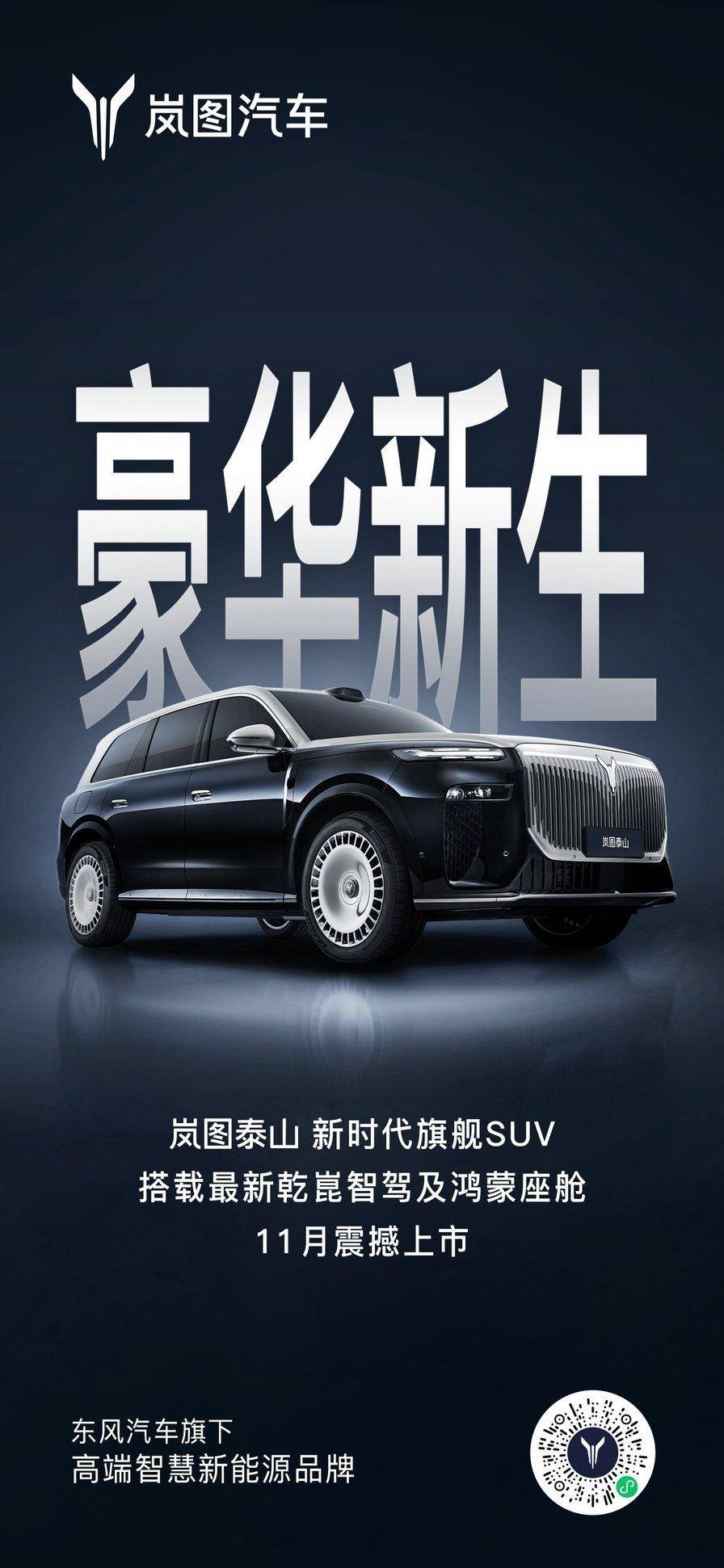 【有车开车资讯】10月20日,,岚图汽车宣布,其新时代旗舰SUV——岚图泰山将于11月正式上市。作为岚图汽车的技术集大成之作,岚图泰山将凭借多项领先的产品技术,为全尺寸豪华SUV市场树立全新标杆。