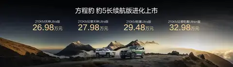 10月20日,方程豹汽车“豹5长续航版”焕新上市,价格26.98-32.98万元;豹8大五座版加推上市,价格37.98-40.78万元。方程豹以“人人可野·拥豹新生活”为核心主张,以豹5的10万台销量达成,以及品牌的20万台销量达成,宣告着电驱越野时代的全面到来。豹5持续蝉联硬派越野销量冠军,登顶“越野新王”,豹8则以引领40万级高端新能源SUV的姿态成为比亚迪华为联手打造的“稀缺旗舰”。本次方程豹豹系列产品,实现了DMO平台的DMO+升级、华为乾崑智驾的ADS 4升级、以及比亚迪智慧生态等多项顶级核心科技的全面升级,并带来续航、安全、舒适、操控等全维度的系统性优化,豹系列焕新引旷野出行。