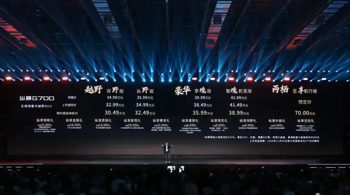 2025年10月19日,以“至 前所未至”为主题的纵横G700全球上市发布会在安徽芜湖宜居国际博览中心落下帷幕,作为纵横旗下首款量产车型,新车定位“全领域豪华越野SUV”,共推出4个版型,官方指导价为32.99万元—41.49万元,限时超级焕新价30.49万元起,并带来十大上市专属购车权益,旨在为用户提供从购车、用车到玩车的全链路尊享体验。