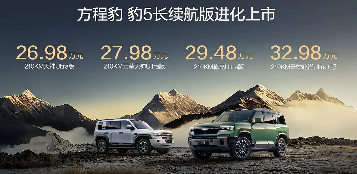 10月20日,方程豹豹5长续航版正式上市了,新车共推出4款车型,售价区间为26.98-32.98万元。顾名思义,新车的长续航就是是纯电续航,因此它的纯电续航达到了210km(CLTC工况),即便用作市内代步也够了。至于新车的整体表现,我们接着看下去。