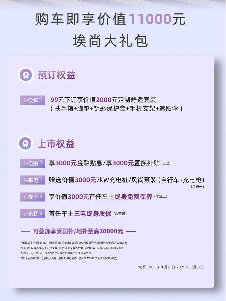 与此同时,用户下订即享价值11000元埃尚礼包,包括首任车主三电终身质保、首任车主终身免费保养,直接降低后续用车成本,同时还提供3000元金融贴息/置换补贴,以及价值3000元的7KW充电桩/风尚套装,进一步减少购车支出。此外,还可叠加享受至高20000元的国补/地补,以实在权益降低购车门槛。