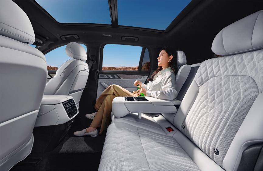 二排新增多功能中央扶手,放倒秒变商务四座行政座舱;二排小桌板,既是长途自驾的阅读桌和移动餐吧,又是商务出行的移动工作台。全车Nappa真皮覆盖,三档加热、通风和8点式背部按摩由前排独享进阶为四座同享,带来二排舒压放松的平权,搭配双层静音隐私玻璃和遮阳帘,能有效防晒、保护隐私;同时,副驾还新增280mm一体式4向电动腿托,可一键开启女王专享,舒适躺姿堪比航司头等舱。