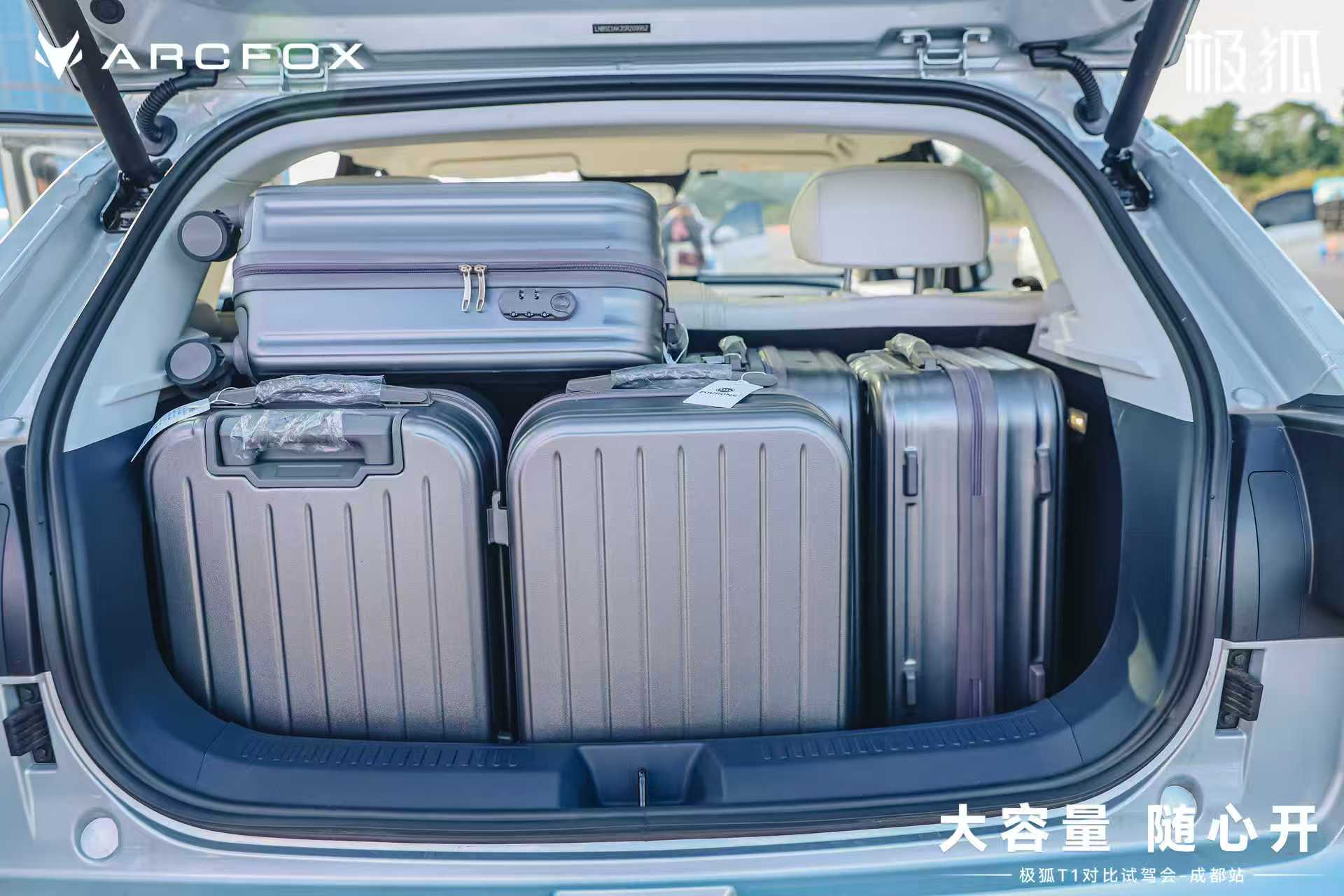 作为家庭用户,空间与实用性是首要关注点。车身尺寸方面,极狐T1长宽高分别为4337/1860/1572毫米,轴距为2770毫米。采用了四轮四角,后排腿部空间明显宽敞,身高1.85米的乘客也能自然伸展。其后备厢常规容积459L,放倒座椅后可扩展至1352L,并设有74L下沉式隐藏空间,露营装备、婴儿车可分层存放。另外全车还配有32处储物空间,可以随手放下一些小件物品。