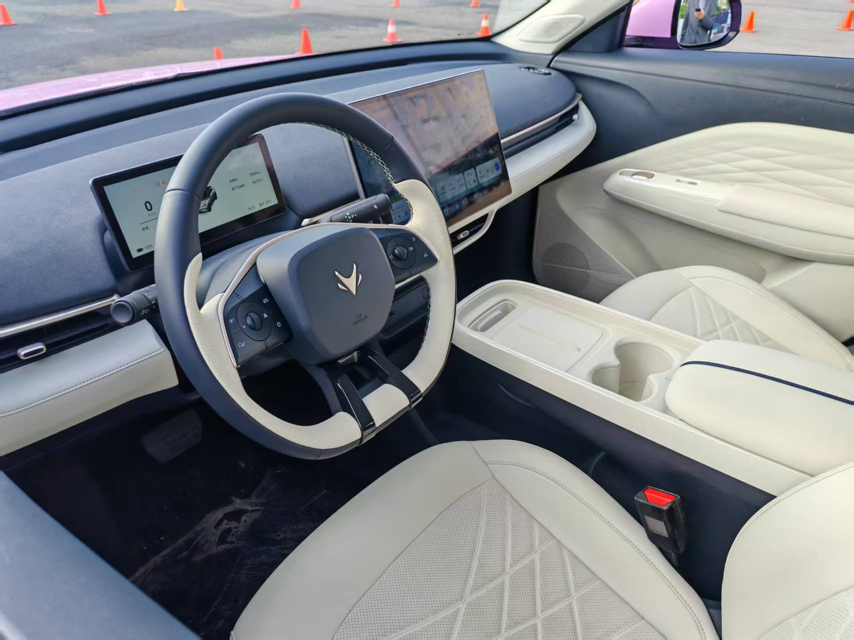 进入车内,极狐T1采用目前主流的环抱式科技座舱,双色拼接的内饰配合看上去也比较典雅。虽然只是一台十万内的代步车,但车内也运用了Microcloud纤维绒面料,车内的质感做到了越级。