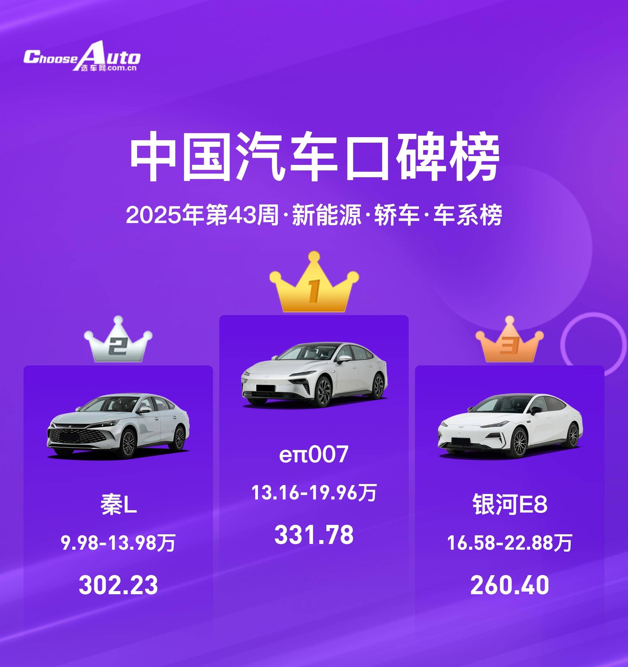 以秦L和银河E8为代表的车型,主打的是“极致性价比”。前者在13-20万的价格区间内获得了最高的331.78分,后者更是将起售价压至10万以内,同时保持了302.23的高分。这意味着选择它们的车主普遍认为,车辆在续航、配置、空间和日常使用成本上,给出了远超其价格的表现,感觉“物超所值”。
