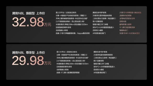 10月28日,“大六座安全豪华SUV”腾势N8L正式上市,共推出2款车型,官方指导价为29.98万元~32.98万元!N8L全系标配“六大核心科技”,以超越传统豪华的品质标准,诠释家用车的豪华感、安全感与科技感,创造让全家人动心、舒心、省心、安心、暖心的出行体验,以“五心体验 三感相伴”,定义美好出行。