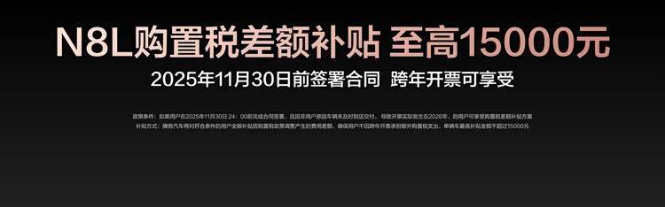 为回馈广大用户的支持与信赖,腾势N8L特别推出限时购车权益,权益价值至高10.67万元!包括价值1.7万元的三年免息,最高1万元的置换补贴。此外,不必担心因为交车晚,享受不到购置税补贴:在2025年11月30日24点前完成合同签署的用户,如果因非用户原因车辆未及时交付,导致开票实际发生在2026年,可享受购置税差额补贴,最高1.5万元!