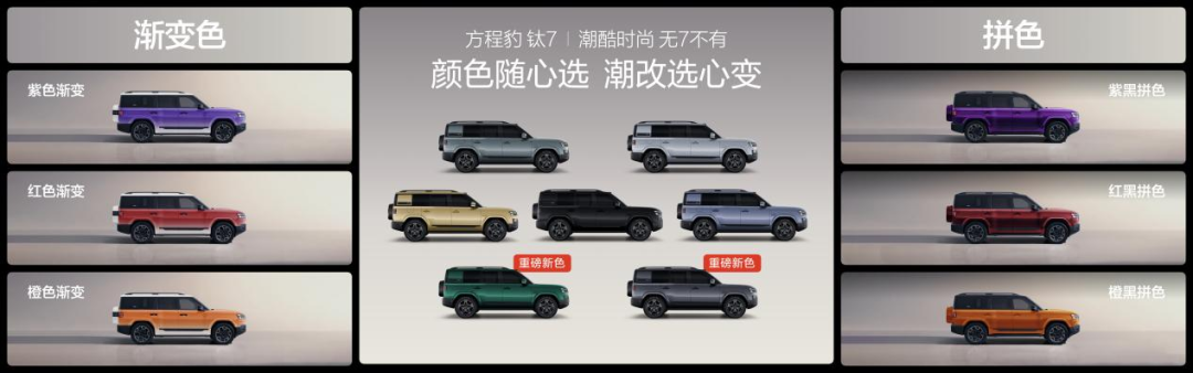 被用户评价为“电动路虎”的方程豹钛7,不仅有着传统越野车的硬朗方正外形,在充满“圆润”的汽车世界中独树一帜,更凭借着“星际方舟”的设计语言,为钢筋铁骨的硬汉形象增加了几分类似变形金刚的科幻感,再加上满足年轻人多元口味的7种外观颜色以及量身定制的潮改配色,稳稳抓住了当代年轻消费者那颗追求不凡、个性、潮酷的心。