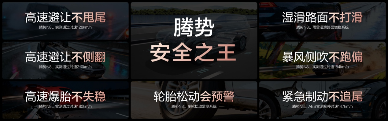 主动安全方面,得益于易三方,腾势N8L能够以128km/h高速避让不甩尾、210km/h高速避让(鱼钩测试)不侧翻、180km/h高速爆胎不失稳、154km/h暴风侧吹不跑偏、147km/h AEB自动紧急制动、不怕雨雪路面打滑、车轮松动监测系统,以科技安全守护家人出行安心。腾势汽车不愧被称为新能源汽车的“安全之王”。