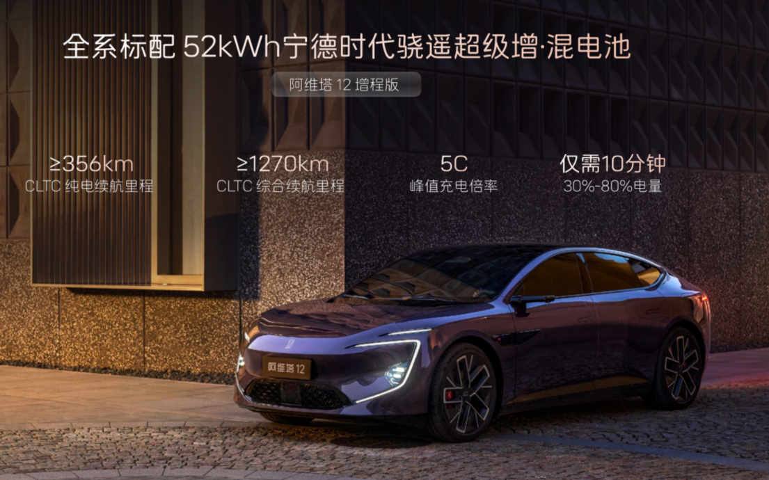 阿维塔12四激光版最懂中国消费者的一点,就是同时提供纯电和增程两种动力。纯电版94kWh电池,后驱版CLTC续航755km,四驱版零百加速3.8秒,一脚电门下去能把不少跑车甩在身后;增程版更狠,52kWh宁德时代电池,纯电续航356km,综合续航1270km。