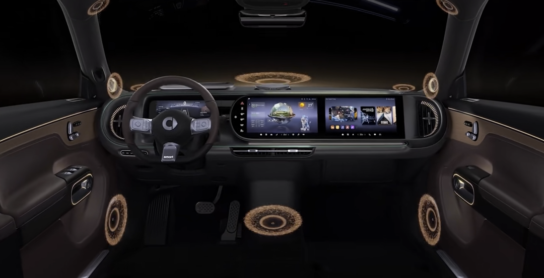 车机部分,它同样搭载桌面级的AMD V2000芯片驱动的车机系统,包括10.3英寸全液晶仪表盘、双13英寸的2.5K联屏以及25.6英寸AR-HUD抬头显示构成。