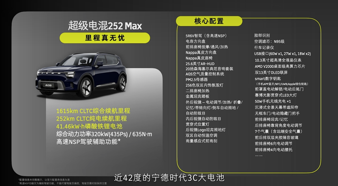 这个版本的电池升级为了41.46度的宁德时代电池,CLTC纯电续航从120km升级到了翻倍还有余的252km,已经足矣满足大多数人一周的通勤需求。