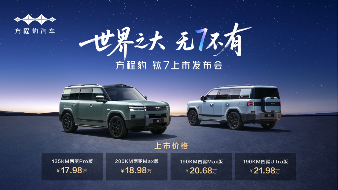 钛7于9月9日全国正式上市后,持续掀起热潮。作为方程豹汽车“大五座天花板”的开创之作,这款融合“悦己宜家”理念的科技大空间SUV凭借智能、舒享与硬派兼顾的产品实力,收获了广大用户的高度关注。新车推出4款配置版本:135KM两驱Pro版17.98万元、200KM两驱Max版18.98万元、190KM四驱Max版20.68万元、190KM四驱Ultra版21.98万元。全系标配智能泊车系统,展现出方程豹品牌对消费者的满满诚意。