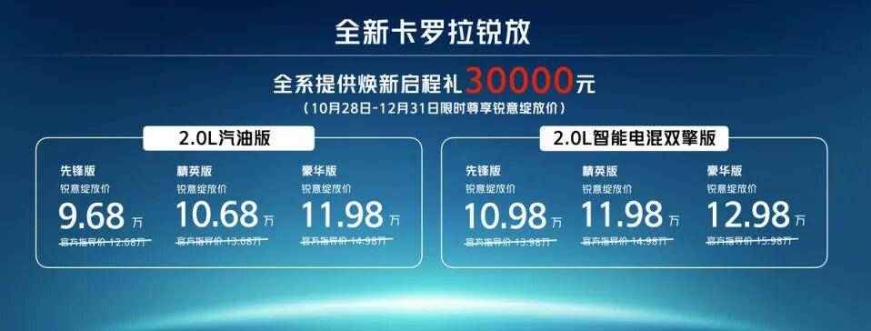 隔壁老王今天跟大伙聊聊刚上市的新款丰田卡罗拉锐放。近日,一汽丰田旗下紧凑型SUV——新款卡罗拉锐放正式上市,售价区间为12.68-15.98万元,锐意绽放价为9.68-12.98万元。这次丰田真是下了狠心,限时起步价直接砸到了9.68万元,这价格在合资紧凑型SUV里可是扔下了一颗重磅炸弹。