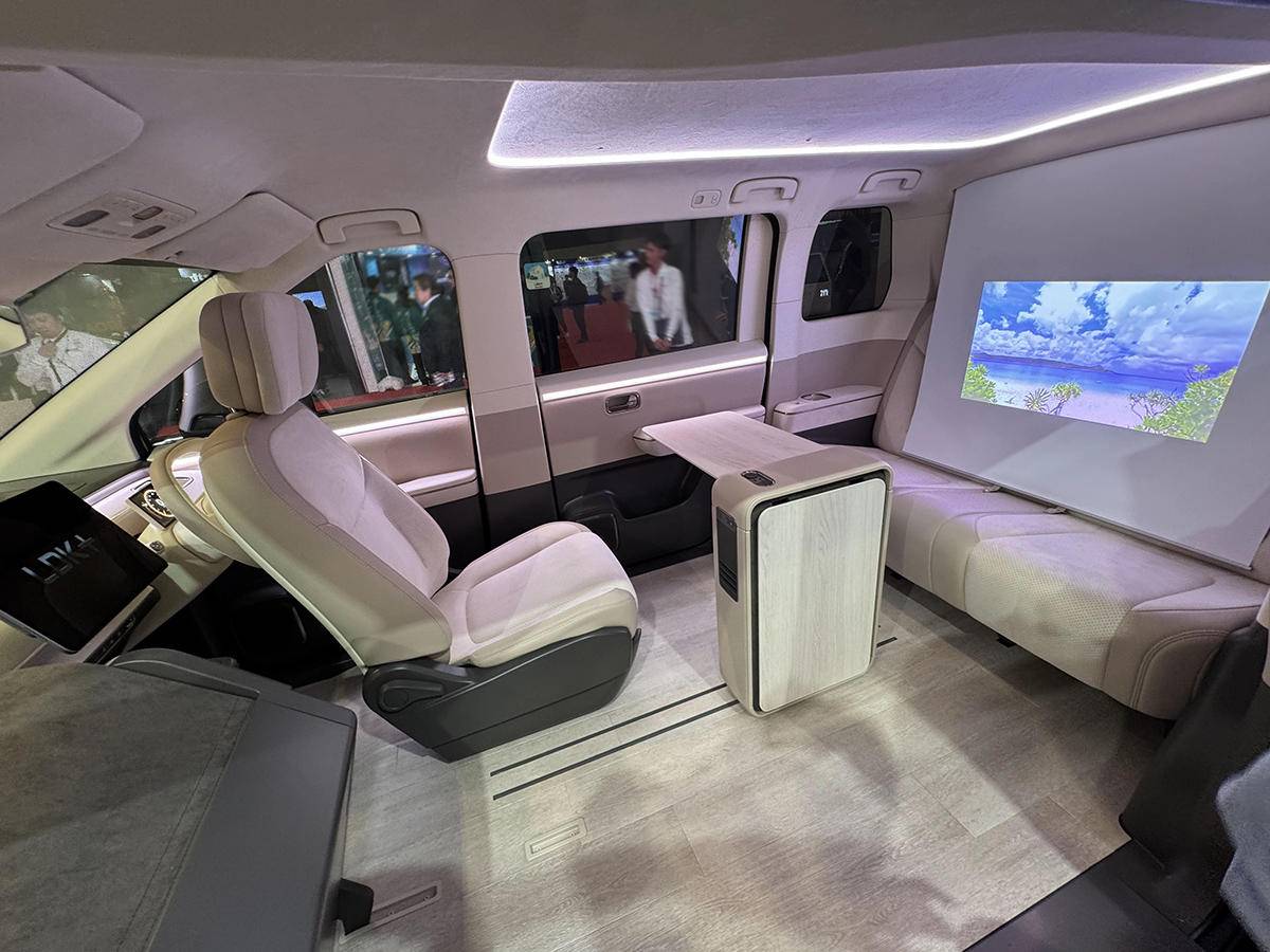 新车采用的是2+3座椅布局,整个车内地板是平整的,主驾座椅能够180度旋转,副驾座椅可以向前掀起。中央扶手箱底部带有前后滑轨,能够在前后排之间调整,还带有折叠式的桌板。另外新车的一大亮点是后部带有伸缩式的大幕布,形成了家庭影院的效果。