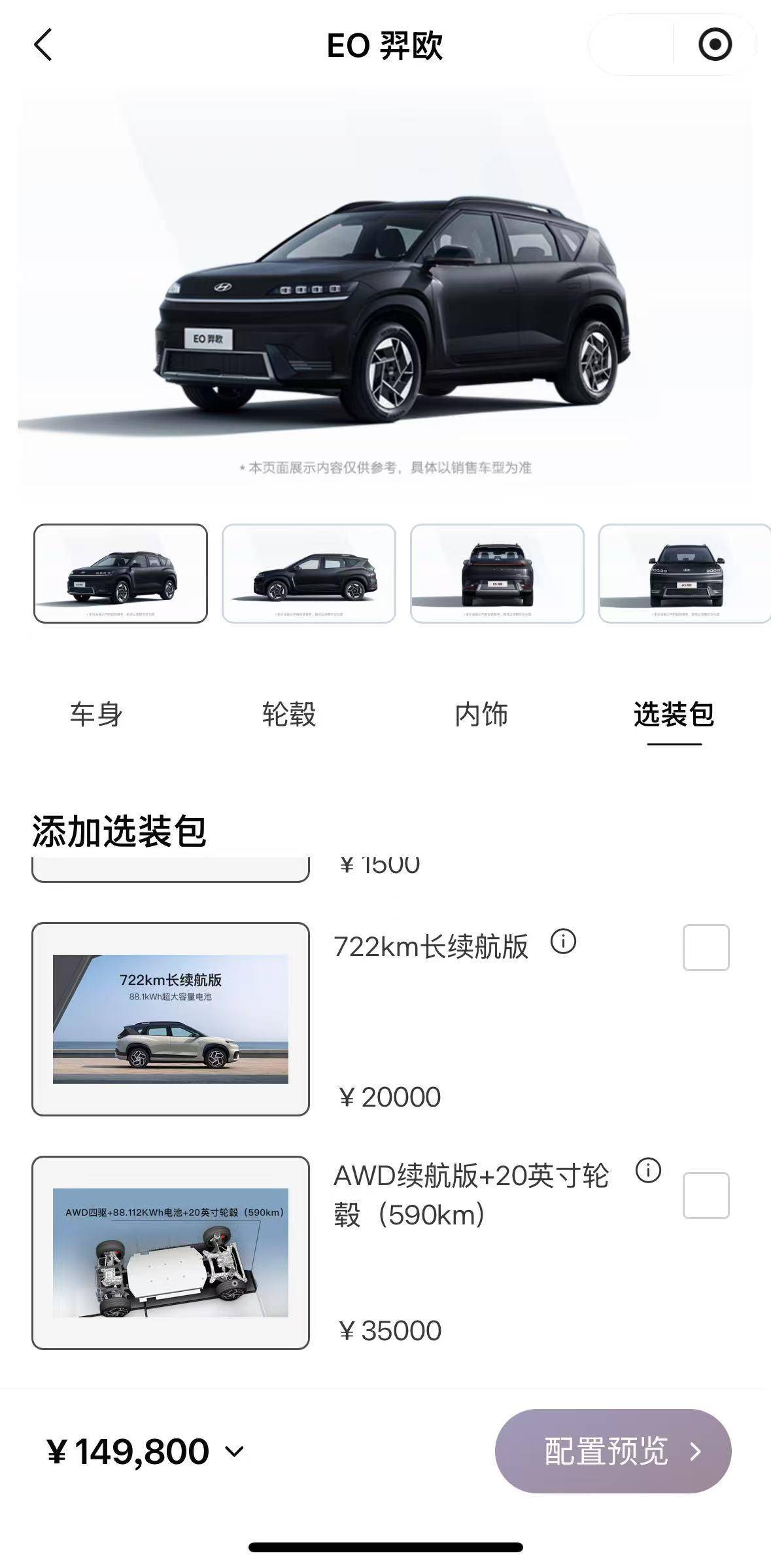 在此之前笔者想先说下新车的选装包,因为它的选装包非常丰富,共有13个,其中值得说的就是价值2万元的长续航版选装包,选了之后它的CLTC续航可以达到722km(两驱),以及价值3.5万元的四驱+20英寸轮毂选装包。另外一些就是配色、配置方面的选装了,大家可以根据自己的需求来选择。